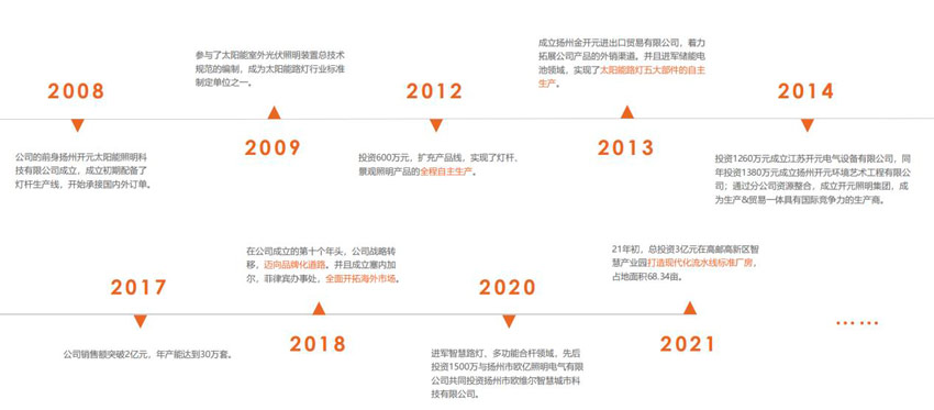 “做好每一盞燈,成為最專業(yè)的太陽能路燈制造商”,作為一家專業(yè)生產太陽能路燈的公司,開元太陽能照明目前擁有太陽能電池板、鋰電池、太陽能控制器、LED燈具、燈桿等專業(yè)生產車間80000平方米,并自主研發(fā)了太陽能路燈控制系統(tǒng),實現了太陽能路燈部件的完全自產。目前已有近100萬套產品使用于世界各地,經受住了不同使用環(huán)境的檢驗。